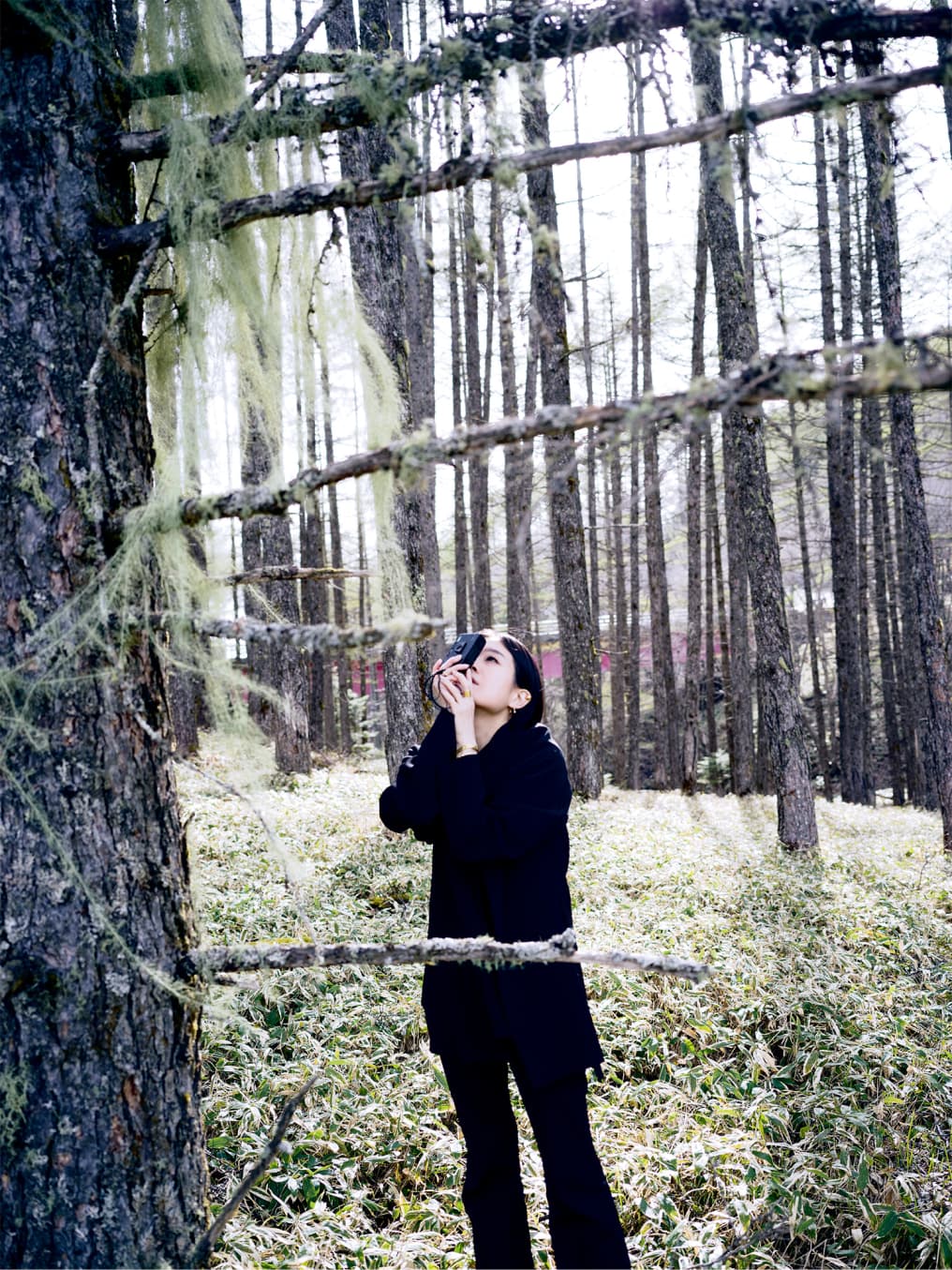 Maiko opts for an all-black ensemble. Out of a desire to blend into her surroundings, she has worn black clothing exclusively for years. Her favourite camera is the Minolta TC-1: she’s on her fourth. The leaves or lichen on the trees shine in her eyes like verdant lace.
