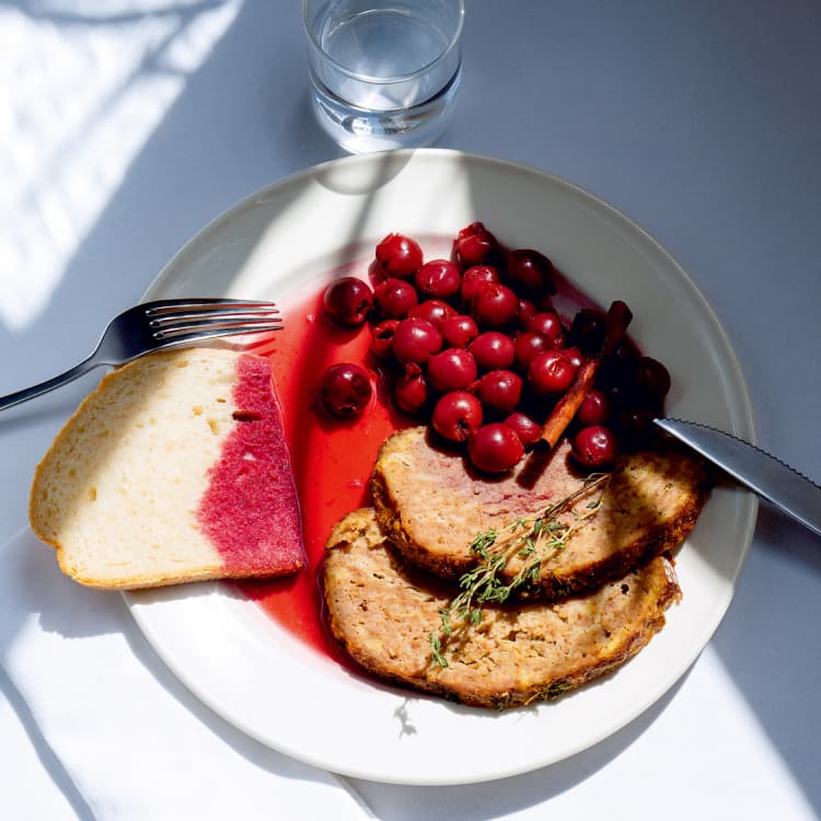 - Test the meatloaf with a skewer. As long as it comes out clean, remove loaf from oven and cut into 1.5 cm slices. Serve on plates with cherry sauce and a side of bread.