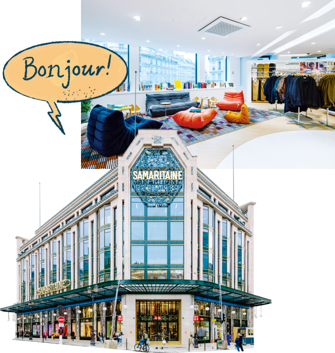 Opened Autumn 2021 on Rue de Rivoli, one of the main thoroughfares in Paris. Located in a corner of the iconic La Samaritaine department store, reborn after sixteen years of renovations that preserved the striking art deco facade, like something from the 1930s. With the partnership of the Musée du Louvre, our close collaborator, we’ve built out the interiors in an artistic fashion. The third floor even has a reading area, where you can browse art books and picture books selected by iconic local bookstores and take a breather on the sofas.