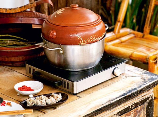 Qi guo ji—steam pot chicken—is Yunnan soul food. As the “qi” (steam, vapor) in the name suggests, the steam is used to cook the chicken meat. For this issue, we’ve asked Meng Na, up-and-coming chef of local favorite Granny’s Kitchen, to share a qi guo ji recipe. The traditional method involves using a qi guo steamer crock, which has a cone-shaped spout in the middle. This allows for the meat to be steamed in its own juices, without adding any water, while retaining all the natural flavors. The result is a nutritious dish.