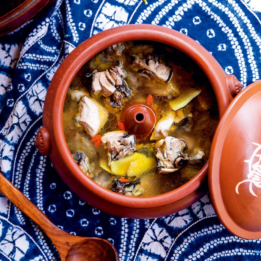 Steaming requires at least thirty minutes, though if time permits, you can let it simmer for as long as 1 hour and cook up a hearty stock. In Yunnan, some recipes call for medicinal herbs like notoginseng, tianma, and shi hu (dendrobium) or exotic mushrooms and a variety of chicken that has black skin and bones. Don’t fret, though, if you can’t find a qi guo or traditional ingredients. What matters most is using fresh chicken and taking your time to neatly prepare things. One sip of the chicken and goji berry broth is worth a thousand words about the depth and breadth of Yunnan cuisine.