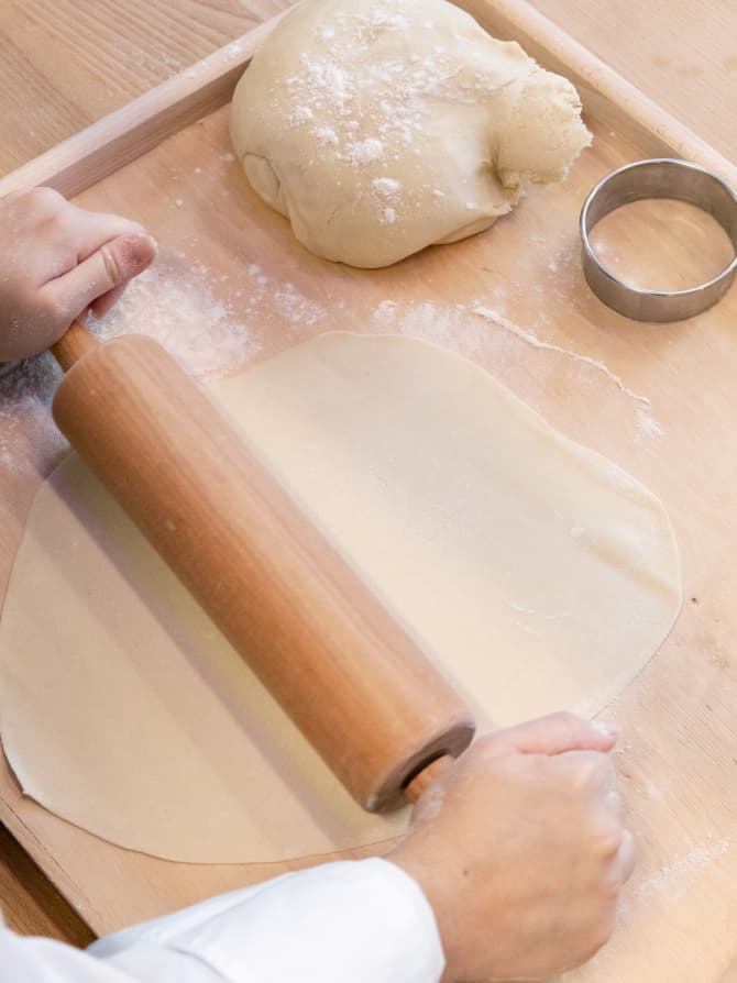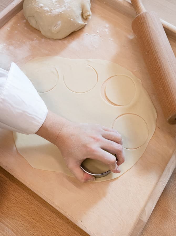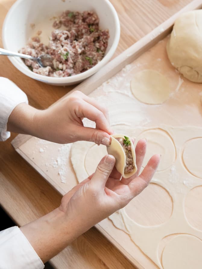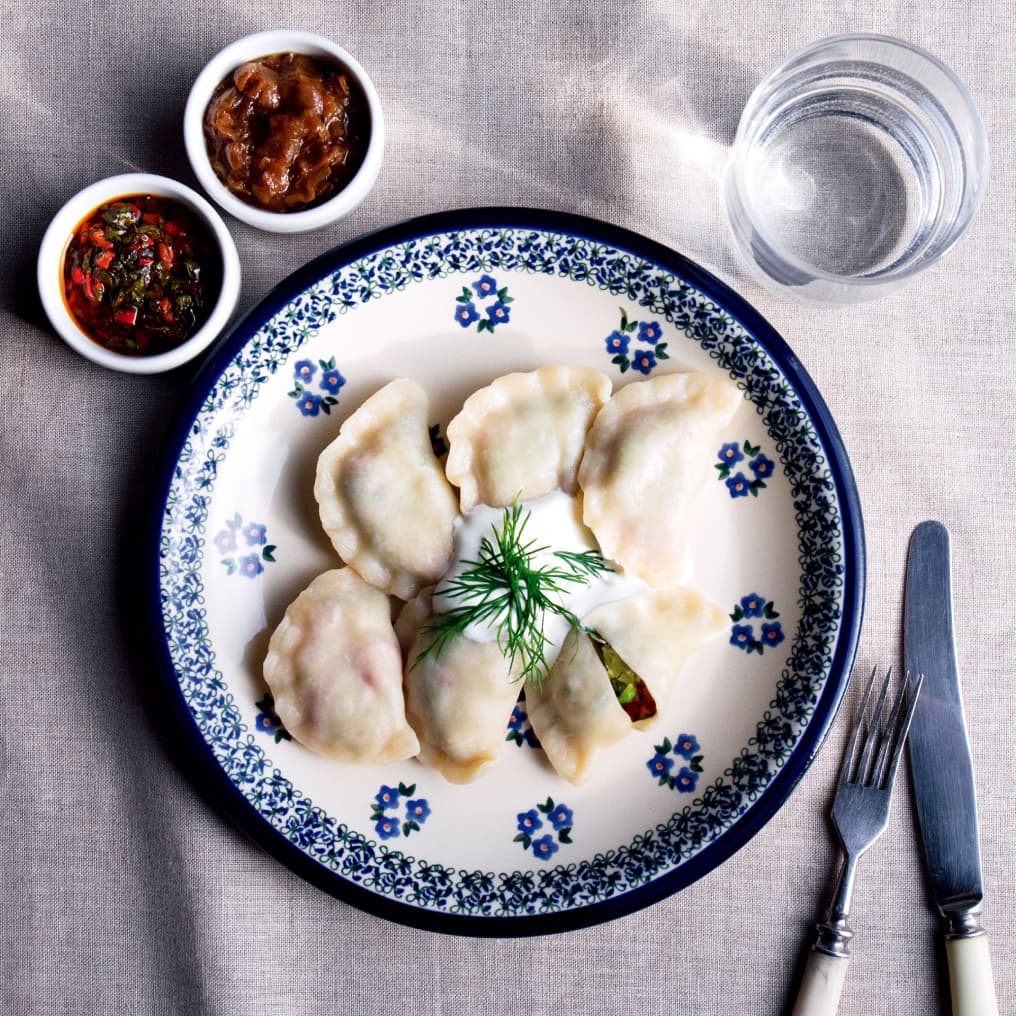 - Divide dough into 4 pieces. Roll very thin (2-3 mm) and cut into circles (8 cm in diameter). Place a spoonful of the filling on one side of each circle. Fold over the circle and pinch around the dough. Plop the dumplings a few at a time into a pot of boiling water. Once they rise to the surface, cook for 2 more minutes. Serve with cold sour cream and dill.