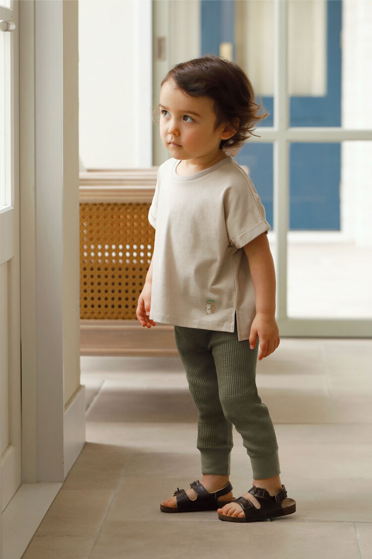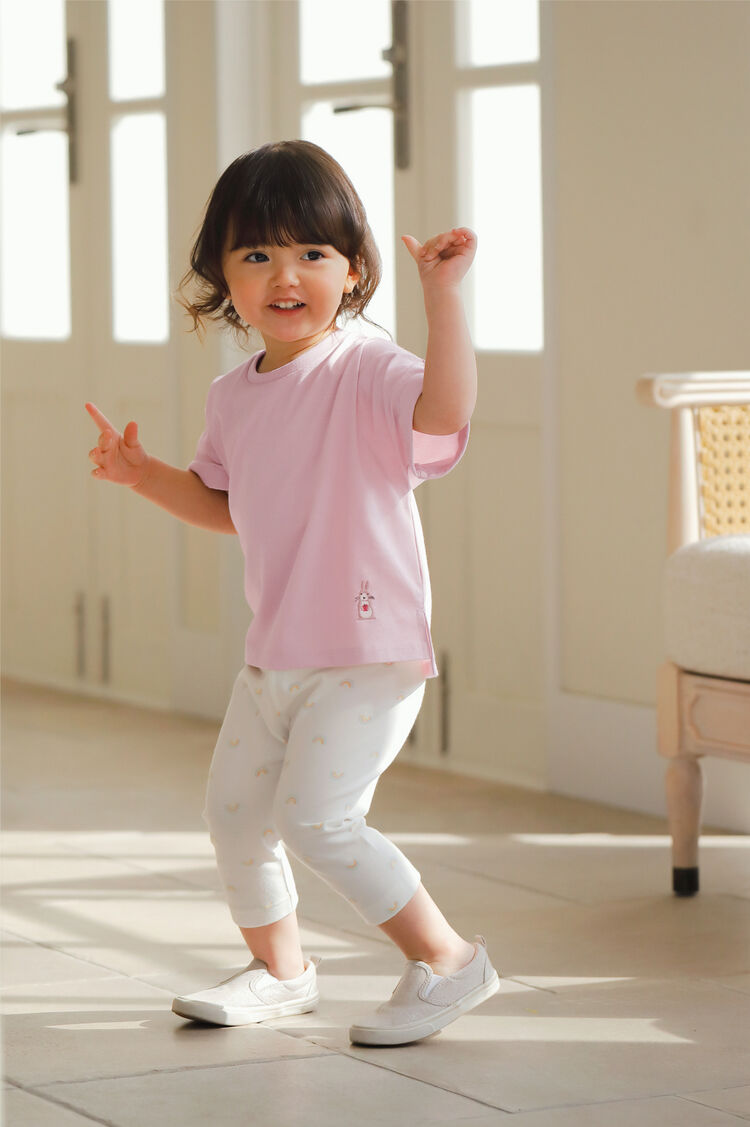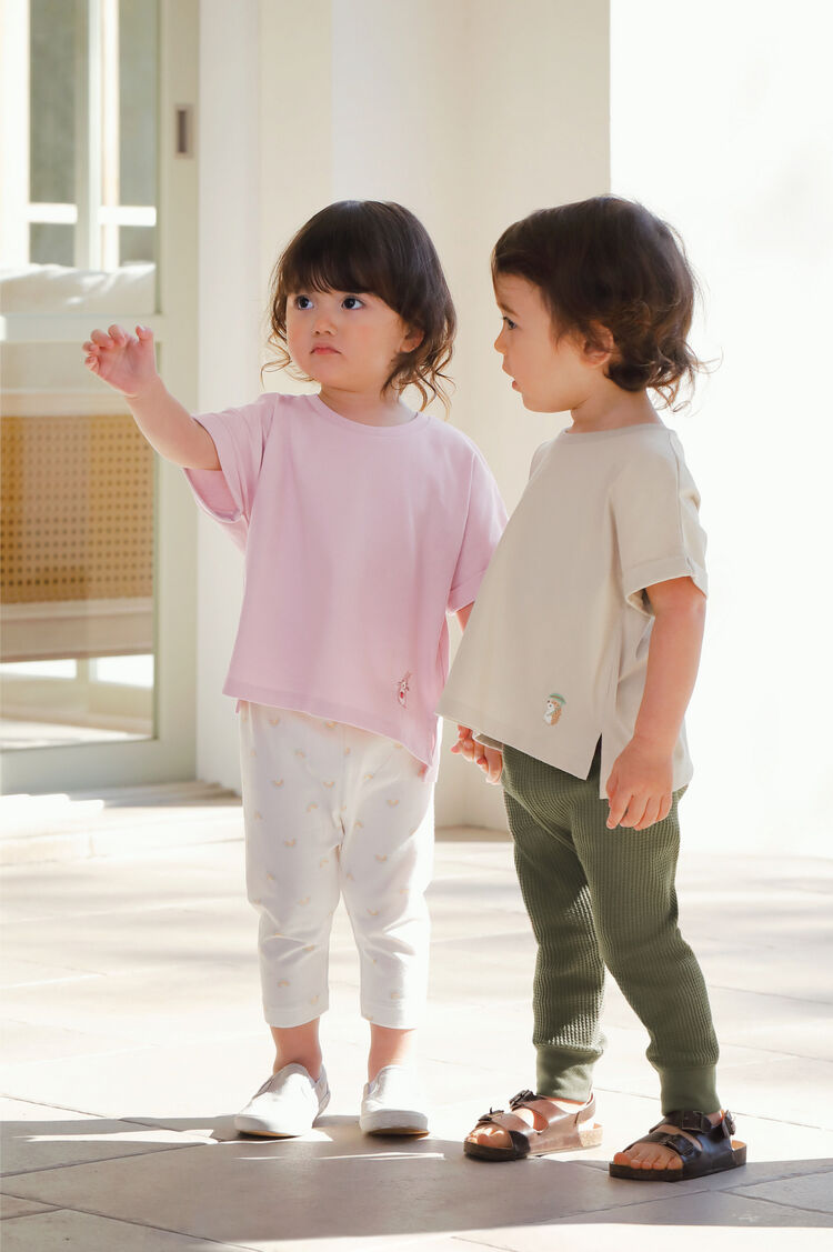A simple t-shirt can be paired with patterned leggings. Leggings with excellent elasticity allow babies to play comfortably, whilst also allowing convenience for mum's and dad's who change their clothes often. Having multiple items of different materials and lengths allows for fun, versatile styling.