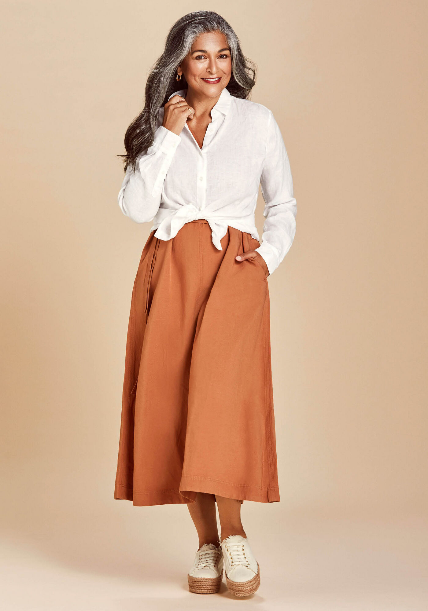 Wearing: Premium Linen Long Sleeve Shirt, Belted Linen Rayon Long Skirt