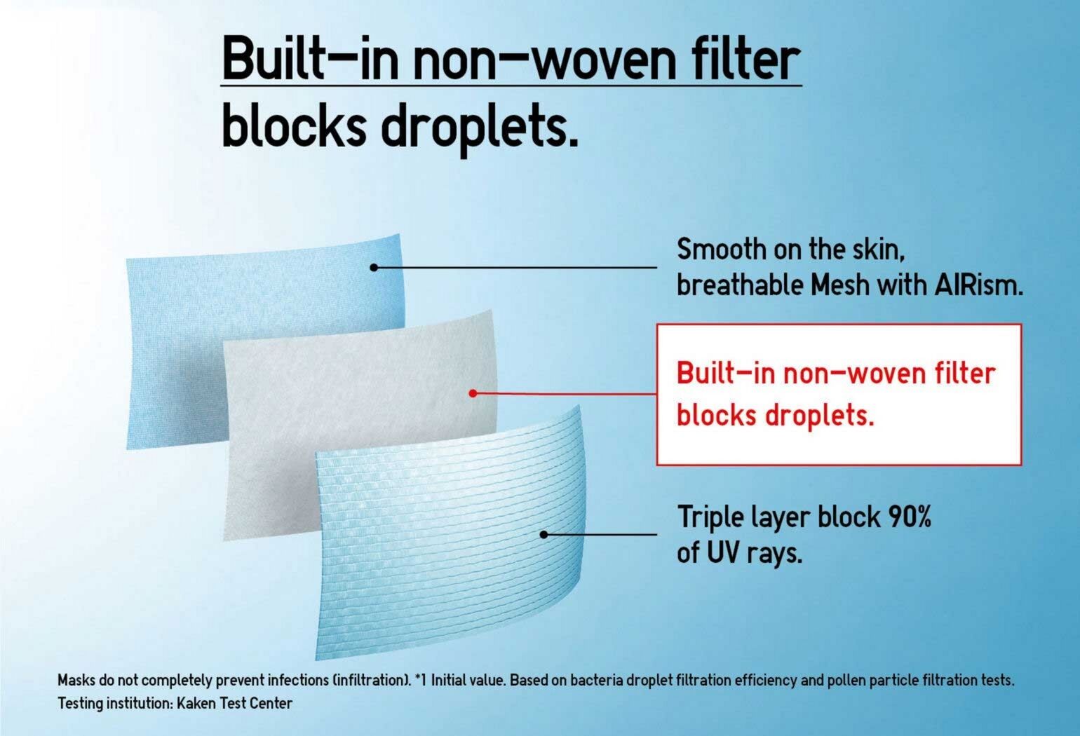 Our masks are one of the most technologically-advanced face masks available with a triple-layer structure that allows for 99% ((1) Initial value) filtration efficiency and is designed to be more practical and comfortable than a standard cotton mask. The AIRism layer helps keep the mask as light and breathable as possible. It also retains filtration qualities after repeated machine washes (filter inside the triple layer structure retains its efficacy after 20 washes at 40 degrees (2))– making it easy to take care of.