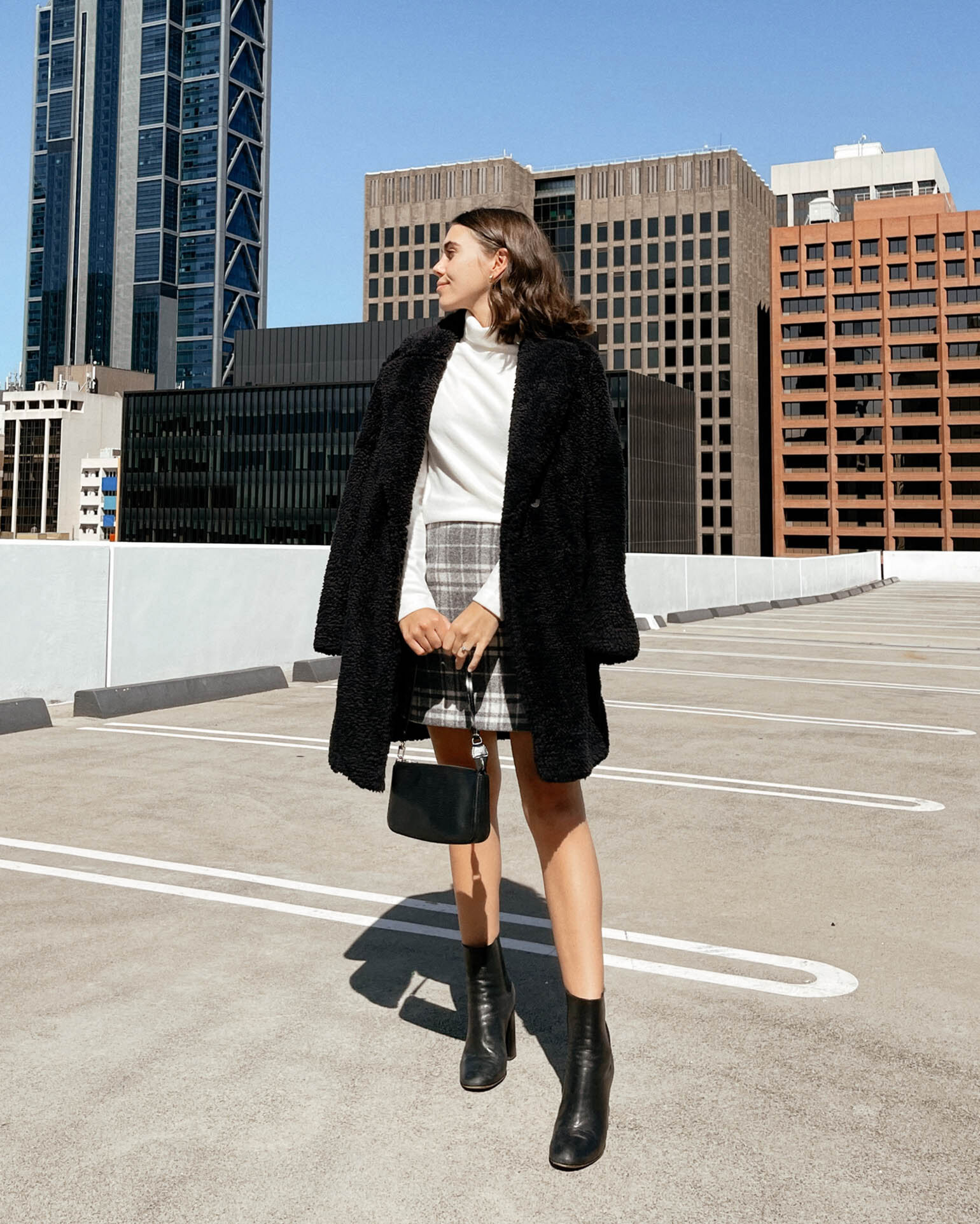 @perthstylesource wears the Pile Lined Fleece Tailored Coat, HEATTECH Fleece Turtle Neck Long Sleeve and Wool Blended Mini Skirt.