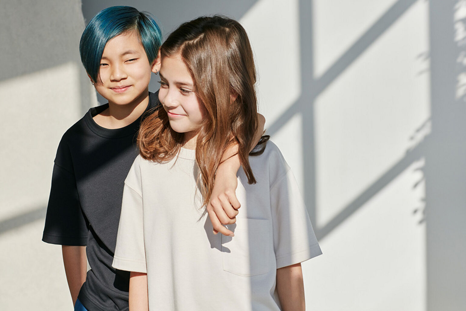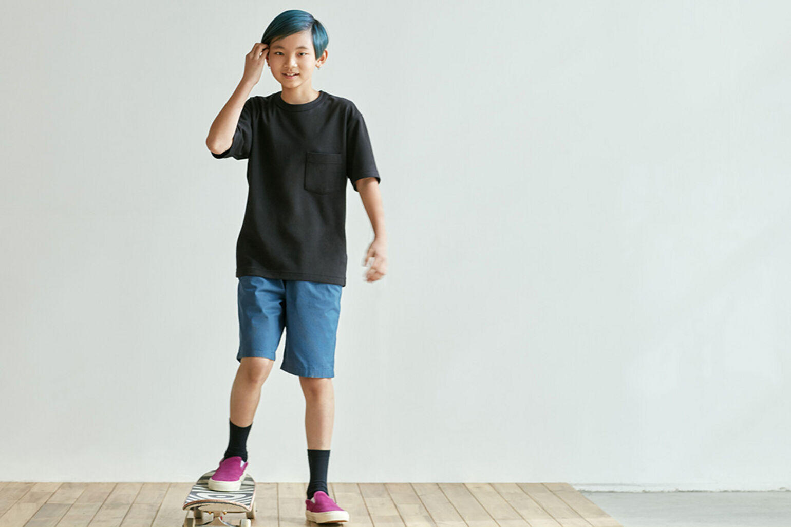 The long-awaited, new AIRism Cotton T-Shirt for kids feels silky and has quick-drying functionality to keep them cool and comfortable even with they sweat. The large pocket serves as a functional detail and casual accent.